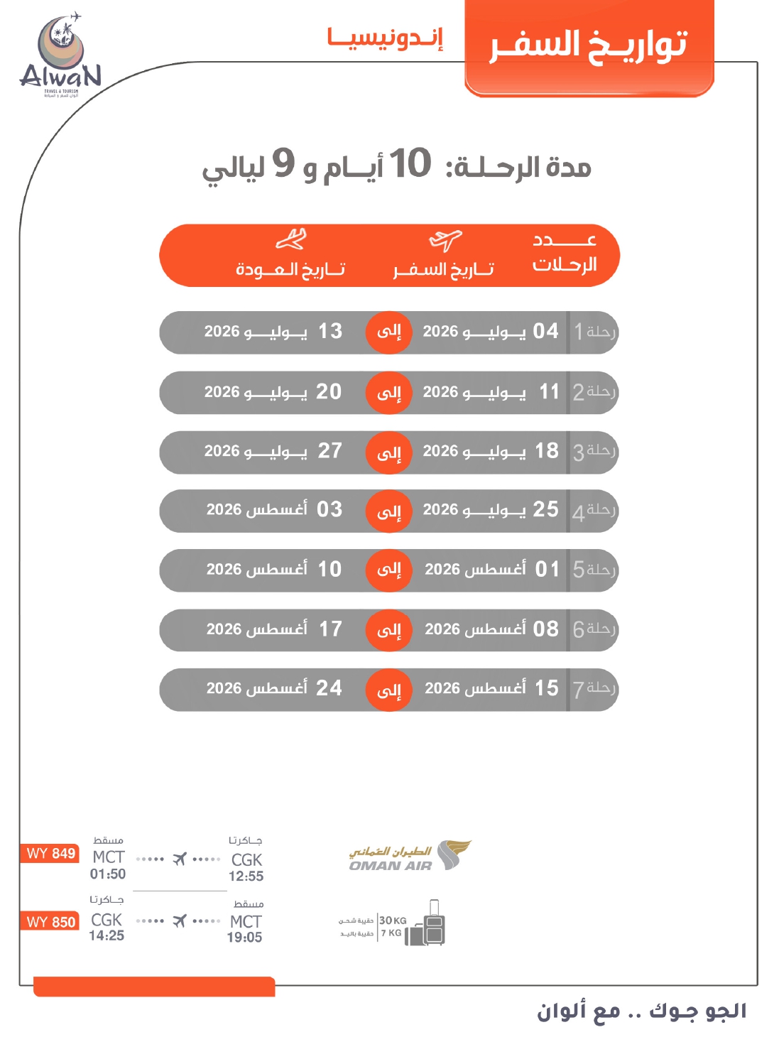 • Oman Air WY850: جاكرتا (14:25) → مسقط (19:05)