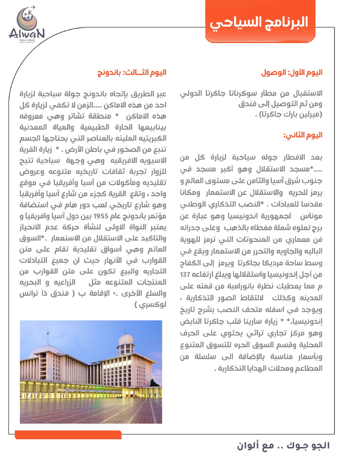 اكتشفوا جمال إندونيسيا مع باقة سياحية مميزة لمدة 10 أيام / 9 ليالي تشمل ثلاث وجهات رائعة: العاصمة النابضة بالحياة جاكرتا، مدينة الإبداع باندونق، وأجواء الجبال المنعشة في بونشاك.