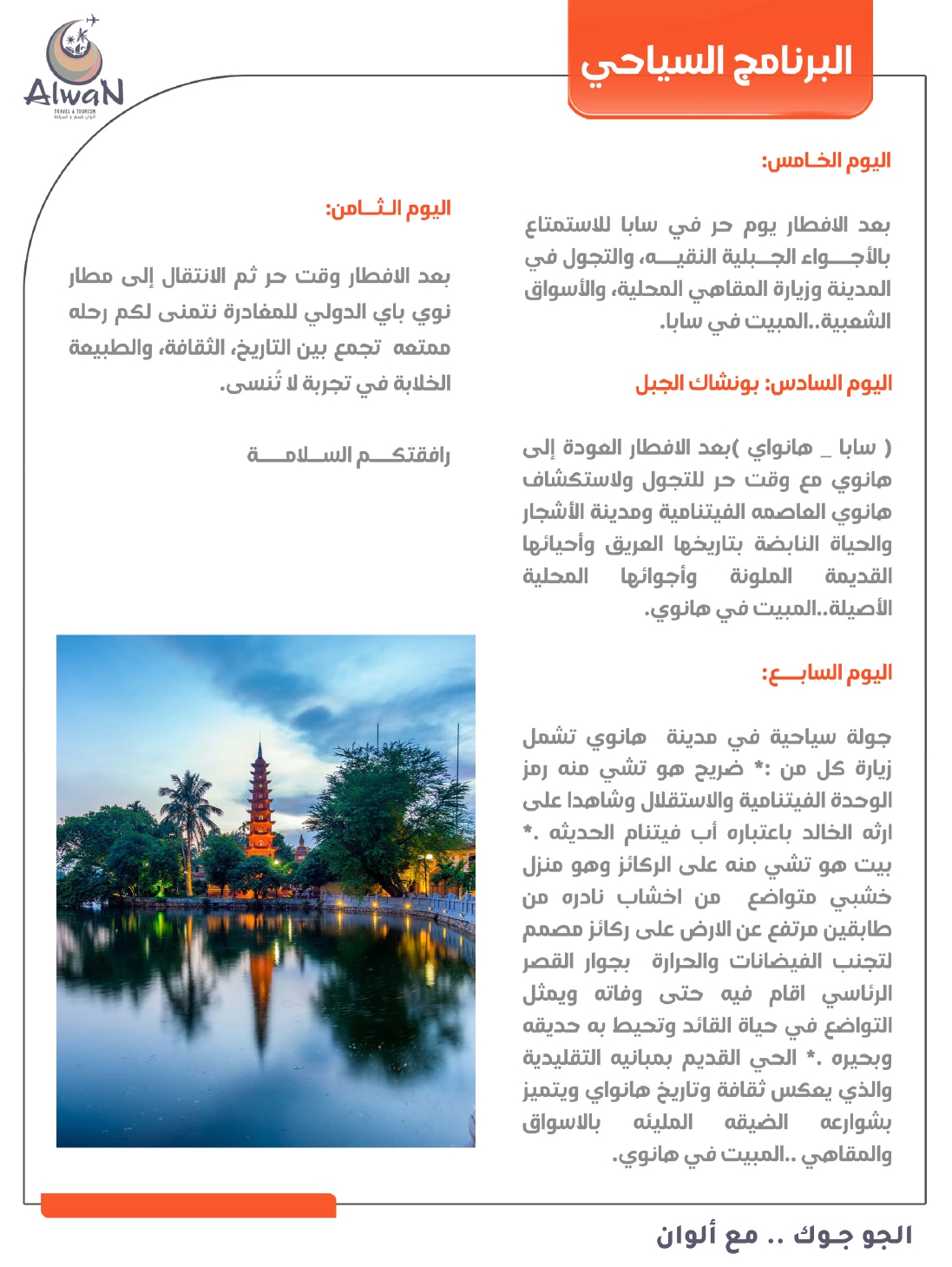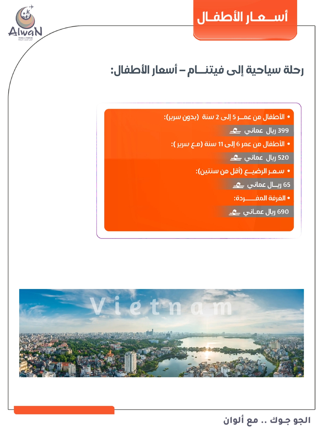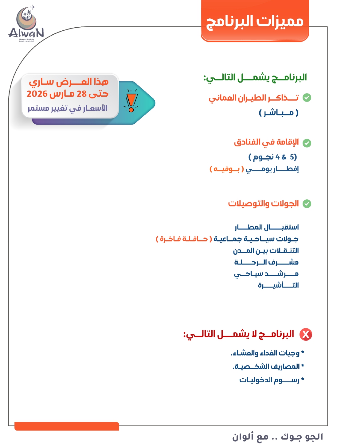 اتصل بشركة ألوان للسفر والسياحة: الهاتف: 76627744؛ وسائل التواصل الاجتماعي: @alwantour. الأسعار قابلة للتغيير.